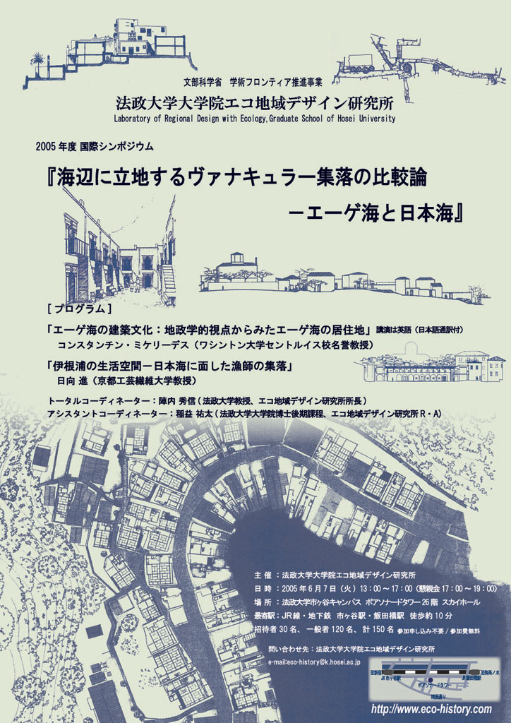 法政大学大学院エコ地域デザイン研究所2005年度国際シンポジウムが開催されました 「海辺に立地するヴァナキュラー集落の比較論-エーゲ海と日本海」 主催:法政大学大学院エコ地域デザイン研究所 2005年6月7日(火)13:00〜17:00 場所:法政大学ボアソナードタワースカイホール26階 [プログラム] コンスタンティン・ミケリーデス(ワシントン大学セントルイス校名誉教授) 「エーゲ海の建築文化:地政学的視点からみたエーゲ海の居住地」 日向 進(京都工芸繊維大学教授) 「伊根浦の生活空間−日本海に面した漁師の集落」