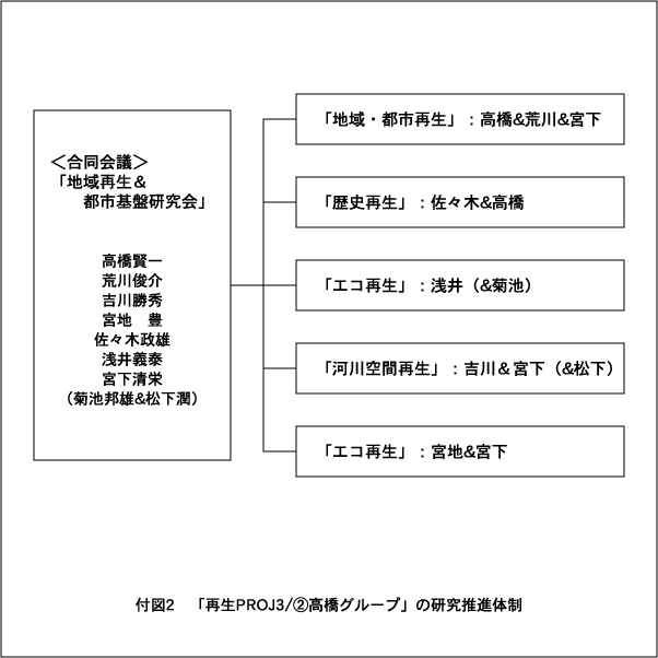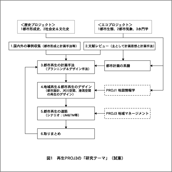 1 「再生プロジェクト3」の役割 (1) 「再生プロジェクト」(水辺都市の再生プランニング)は、「歴史プロジェクト」(1:都市形成史&2:社会史と文化史)及び「エコプロジェクト」(1:都市生態&2:都市気象&3:水文学)の研究成果などを受け[1]「地図情報学」、[2]「地域マネージメント」と[3]「都市再生の計画手法」について提案する。