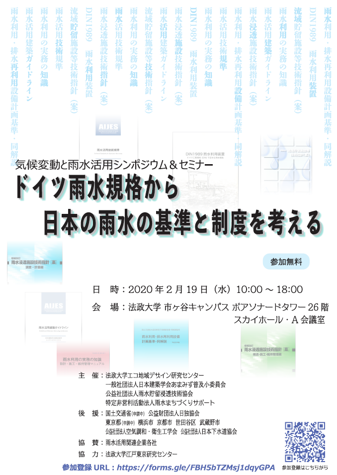 法政大学エコ地域デザイン研究センターでは、2006年2月にドイツの「DIN雨水規格」を翻訳した報告書をまとめました。これがその後、日本建築学会の「雨水活用建築ガイドライン」(2011年)や「雨水活用技術規準」(2016年)の発行につながり、日本における建築雨水規格の礎となりました。今日では、SDGsが世界の環境目標となり、温暖化対策に取り組むことは必須の課題です。その切り口の一つとして、身近に差し迫る雨水の危機に適応することも求められています。早急に整えるべき雨の恵みと災いに向き合う体制について、官民あげて知恵を出し合い具体的な取り組みに結び付けたいものです。