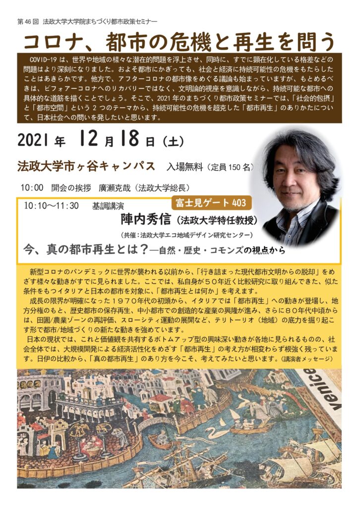 法政大学エコ地域デザイン研究センターは,法政大学大学院と共催で「第46回まちづくり都市政策セミナー」を開催いたします